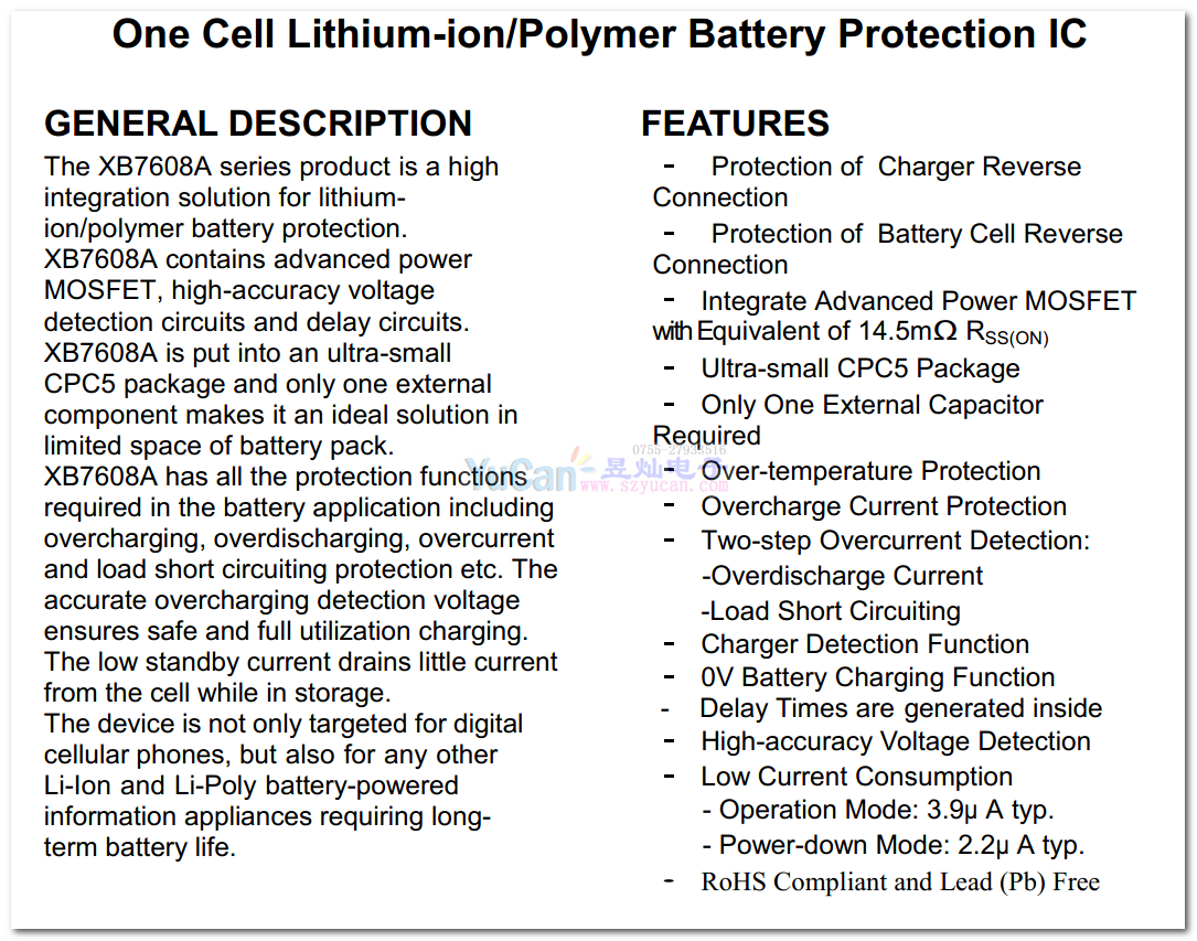 XB7608A CPC5 單節(jié)4.4V鋰電復(fù)合保護芯片 內(nèi)置9Amos