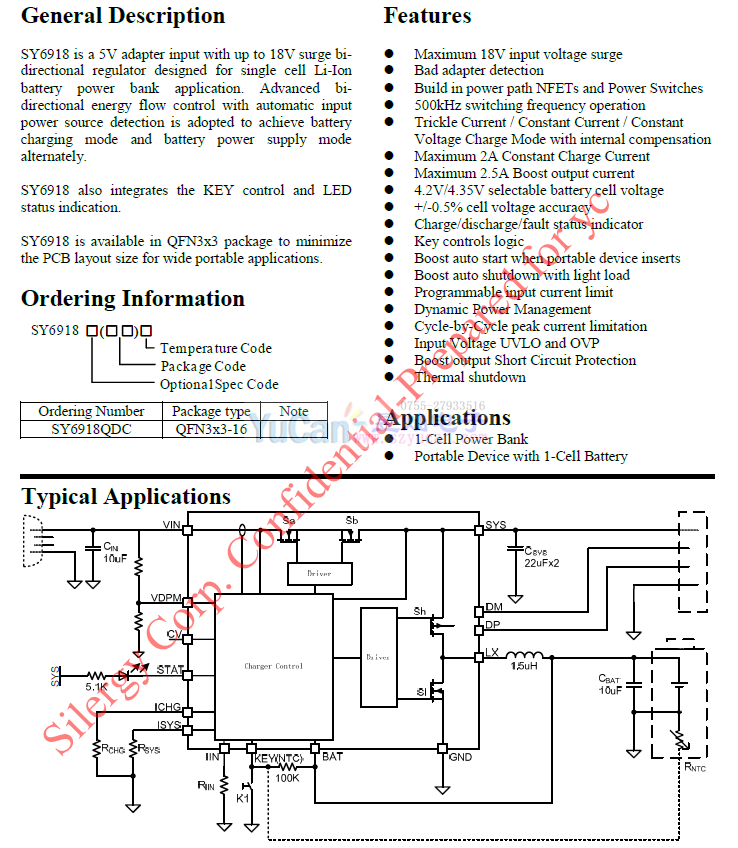 SY6918 QFN3x3-16 移動(dòng)電源二合一芯片 充電2A 放電2.5A 支持BC1.2協(xié)議 電池電壓4.2V/4.35V