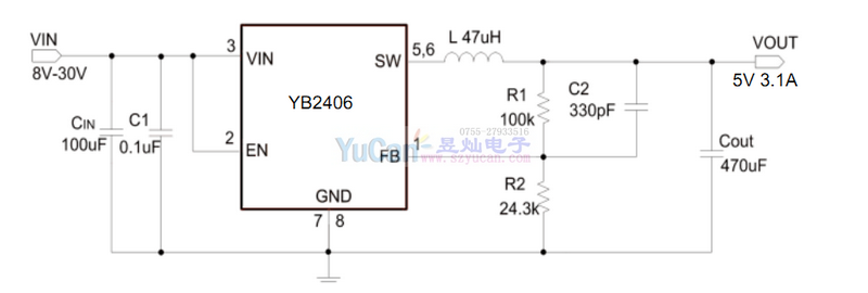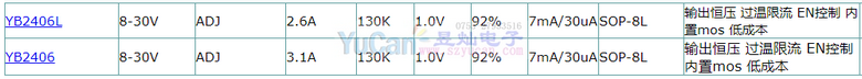 YB2406是支持高電壓輸入的同步降壓電源管理芯片,在8~30V的寬輸入電壓范圍內(nèi)可實現(xiàn)3.1A的連續(xù)電流輸出。通過調(diào)節(jié)FB端口的分壓電阻,可以輸出1.8V到28V的穩(wěn)定電壓.YB2406具有優(yōu)秀的負(fù)載調(diào)整率和線電壓調(diào)整率,在全范圍內(nèi)不超過±3%。YB2406采用電流模式的環(huán)路控制原理,實現(xiàn)了快速的動態(tài)響應(yīng).YB2406工作開關(guān)頻率為130kH,具有良好的EMI特性。