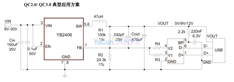 YB2406內(nèi)置線電壓補(bǔ)償,可通過調(diào)節(jié)FB端口的分壓電阻阻值來實現(xiàn).YB2406不僅可實現(xiàn)單芯片降壓電源管理方案,還可以與QC20/QC30識別芯片構(gòu)成快速充電電源管理方案。另外,芯片包含多重保護(hù)功能:過溫保護(hù),輸出短路保護(hù)和輸入欠壓過壓保護(hù)等。