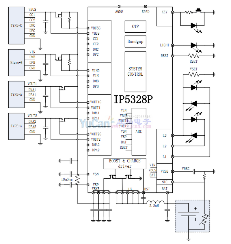 IP5328P 支持雙向快充等協(xié)議移動(dòng)電源SOC