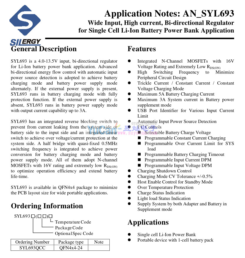 SYL693 4-13V 5A充 3A放 集DPM 輸出限流 EN控制 I2C 及OTG功能的雙燈指示移動(dòng)電源IC