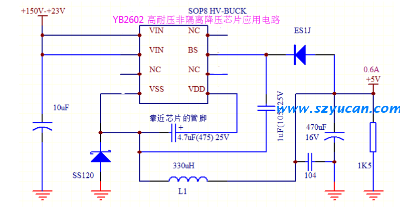 YB2602集成PFM控制器及200V高雪崩能力智能功率MOSFET,用于外圍元器件極精簡的小功率非隔離開關(guān)電源,固定輸山電壓.YB2602內(nèi)置200V高壓啟動模塊。實現(xiàn)系統(tǒng)快速啟動、超低待機功能.該芯片提供了完整的智能化保護功能,包括過找保護,欠壓保護.過溫保護.另外YB2602的降頻調(diào)制技術(shù)有助于改善EMI特性.